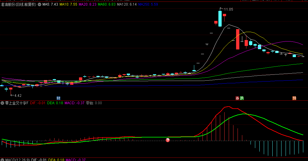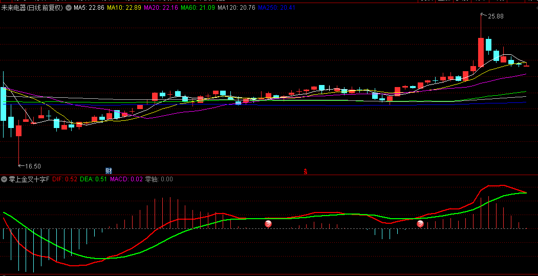 这里我们说的水上金叉指的是MACD的两条线在零轴上面产生的金叉;