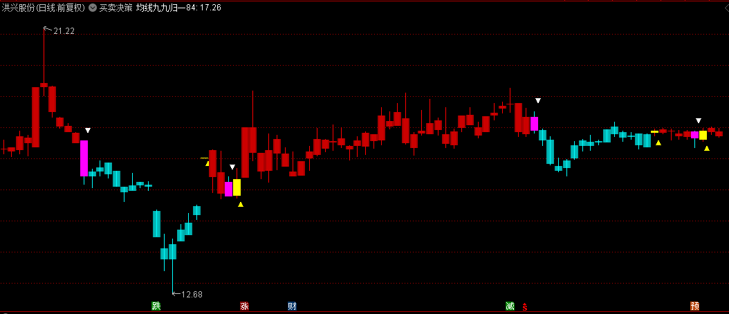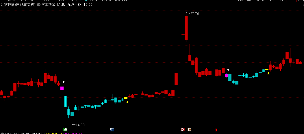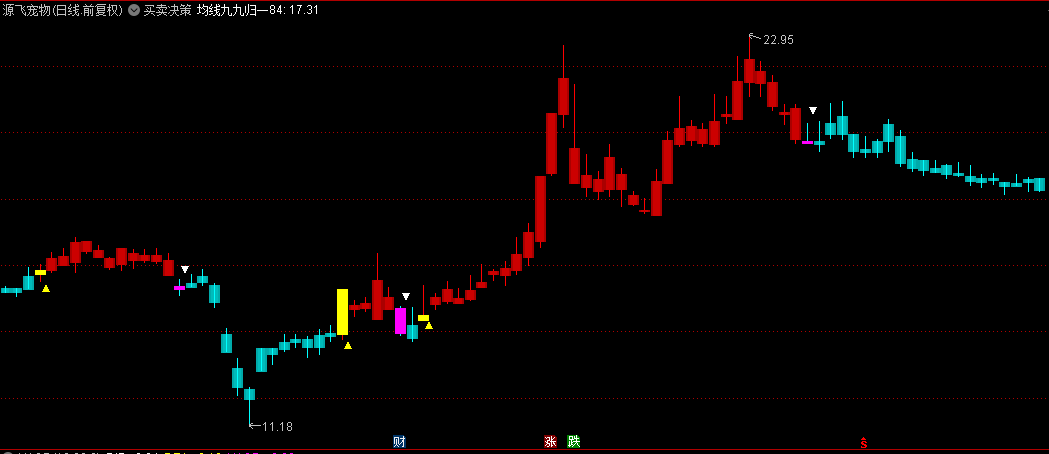 黄色上箭头:出现在K线下方附近,表示指标发出“买入”信号。当指标计算的短期“买线”向上穿越较长期的“卖线”时触发。