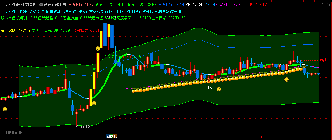 通道带采用红绿双色带状显示,直观展示股价运行区间。