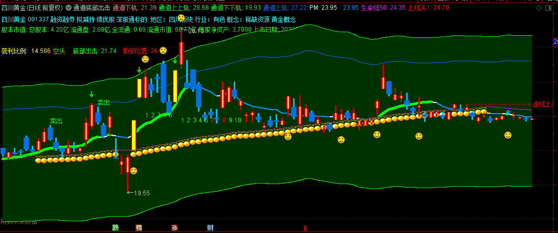 这是一个综合性股票分析主图指标,主要用于识别股价通道运行状态、底部出击信号以及提供全面的股票基本面信息展示。