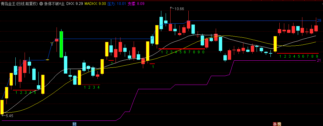 3.多周期共振验证:10日均线与多空线构成双过滤系统,当涨停不破信号与均线金叉同步出现时,"双重确认"进场标准。黄色涨停K线与红色防守位标记形成视觉共振,强调的"行情关键节点"。