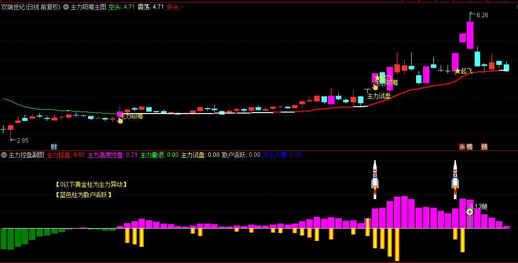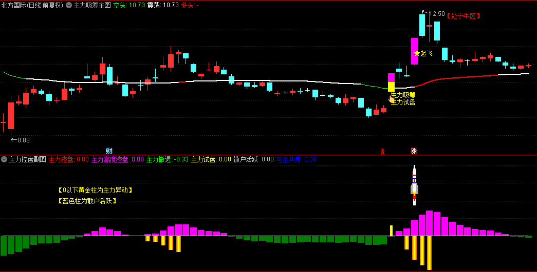 3.红柱显示控盘力度,紫柱标志深度介入,蓝柱反映散户活跃度。