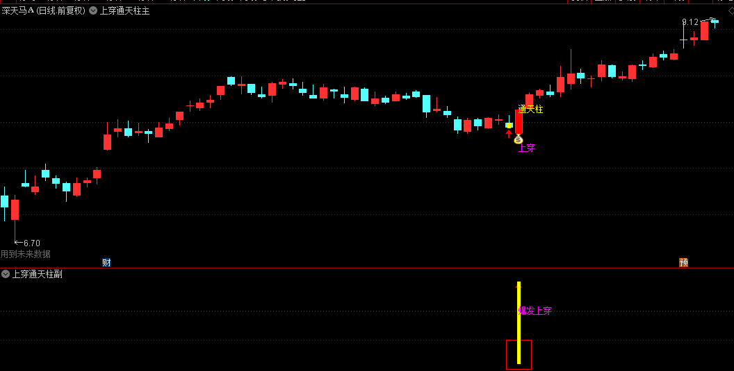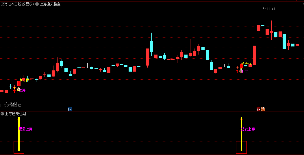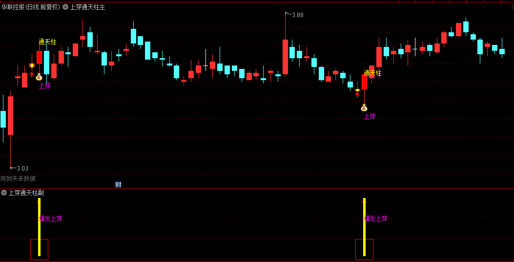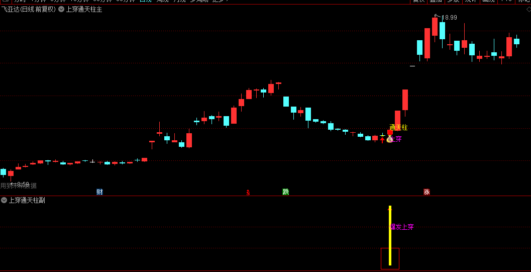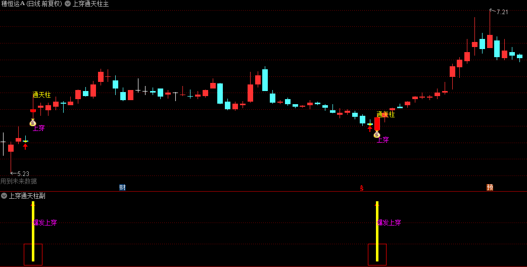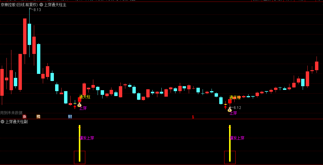 2.红色柱体配合"上穿通天柱"文字提示,表示当日同时满足放量突破、MACD底背离等条件