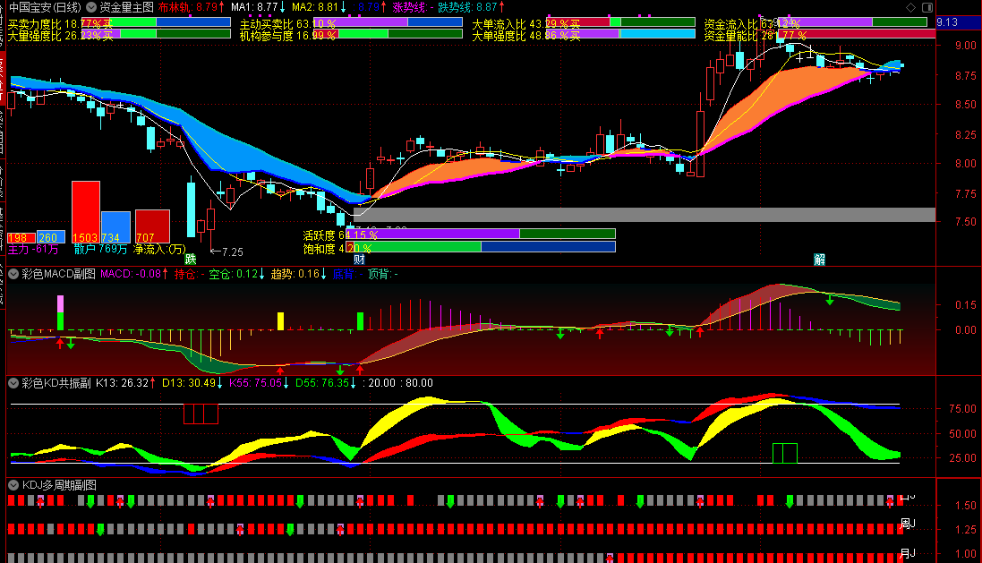 特色功能包括:大单强度比,量化主力控盘程度;机构参与度监控,实时追踪机构资金流向;量能饱和度分析,识别市场过热或过冷状态。辅助的MACD副图采用双色带设计,清晰展示多空转换过程,而KDJ多周期副图则实现了日周月三周期共振分析,有效过滤短期波动干扰。