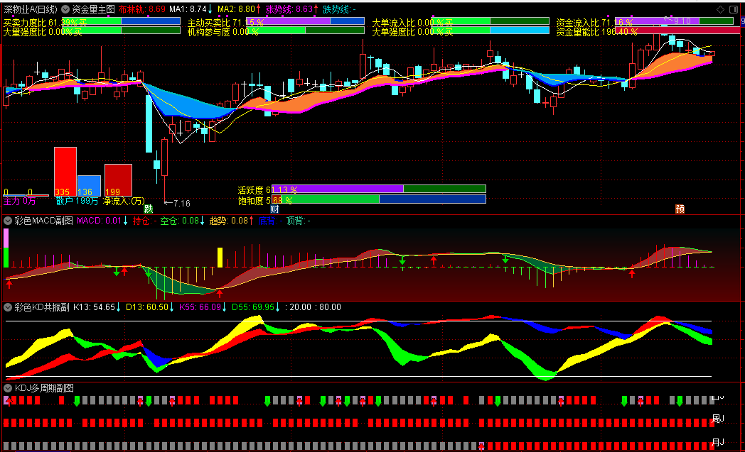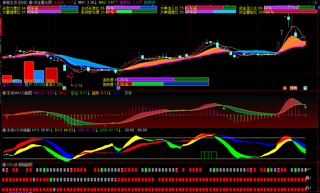 系统特别强化了资金与趋势的协同分析,当布林轨与MA3形成金叉且主力净流入持续增加时,往往是最佳买入时机。彩色KD共振副图通过13日与55日双周期KD组合,可提前发现中长期趋势的转折信号,为投资者提供全面的决策支持。