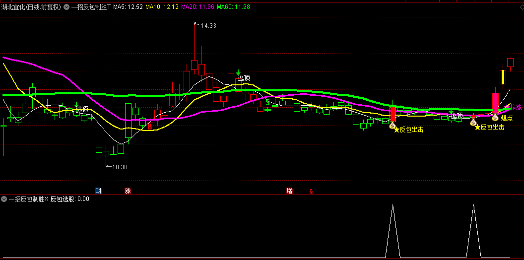 2. 前日阴线实体、当日阳线反包前高、配合成交量放大1.5倍以上。黄色爆点图标配合紫色量柱,标记主力资金强势介入的关键K线。