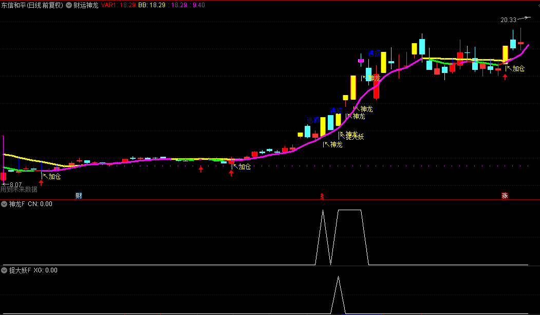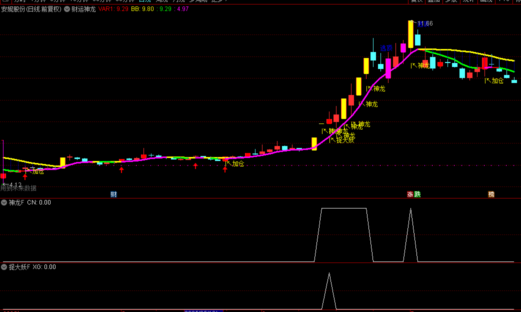 2.买入参考:出现"神龙"或"加仓"信号,且红线上穿黄线时;
