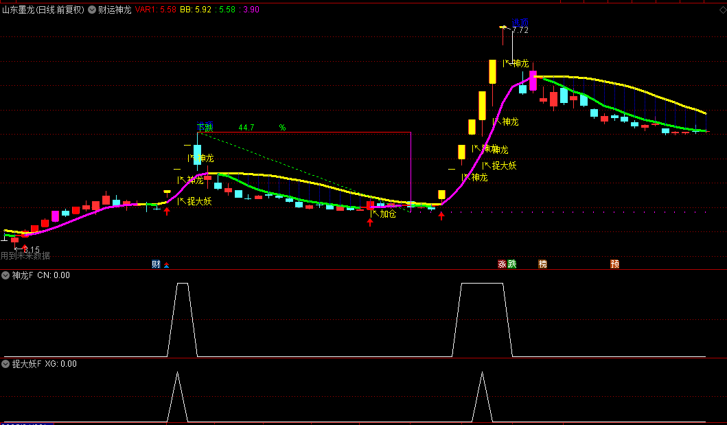 "神龙":当满足放量、涨幅及趋势条件时标记,提示强势启动机会;