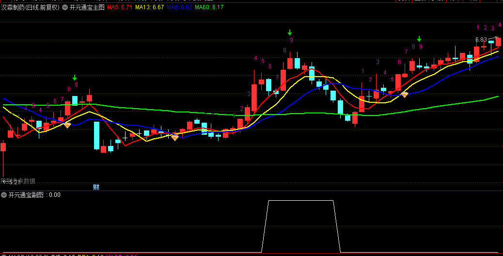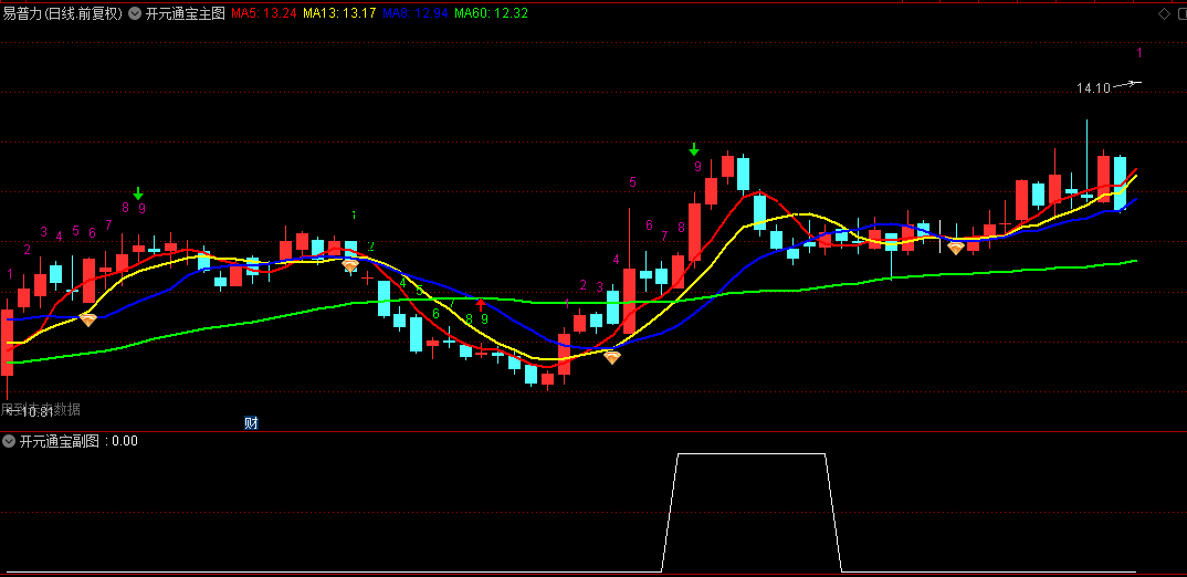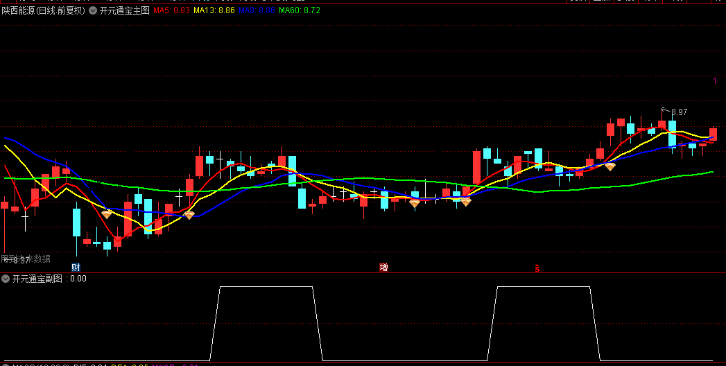 这个指标属于是借鉴了漂亮股票结构形态一书中的均线形态改的,主要是四天均线某天出现交叉菱形的时候就要注意了随时启动,那个形状类似大钱一样,起个名字叫开元通宝,出现黄色钻石的时候关注,说明已经形成菱形块。