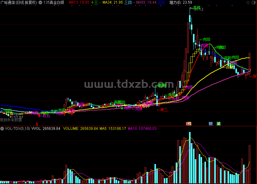 一阳穿三线: DRAWTEXT(YY1 AND YY5 AND YY3,LOW-0.1,'←穿三'),COLORRED;