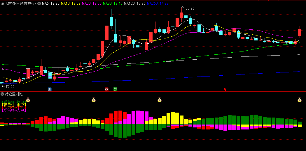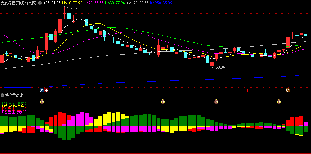 1.观察颜色对比:当红色/粉色柱体(主力/大户)持续高于均量线且向上扩张时,表明大资金进场;绿色柱体(散户)放大则需警惕跟风风险。