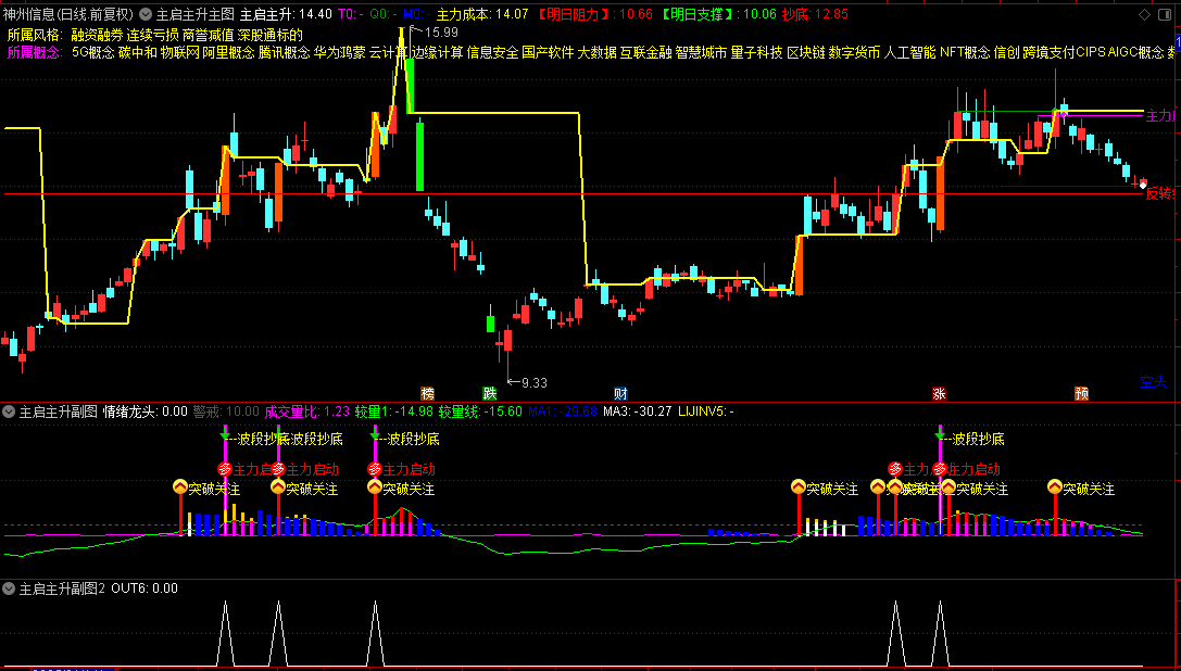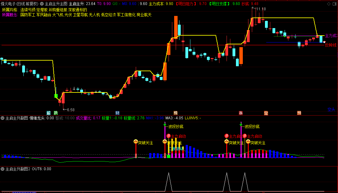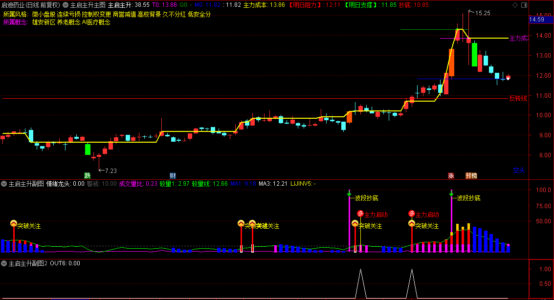 主图通过成本线、风险警示和支撑阻力位辅助判断趋势;副图通过量价分析识别主力启动信号;选股模块则自动筛选符合主力反转条件的个股。