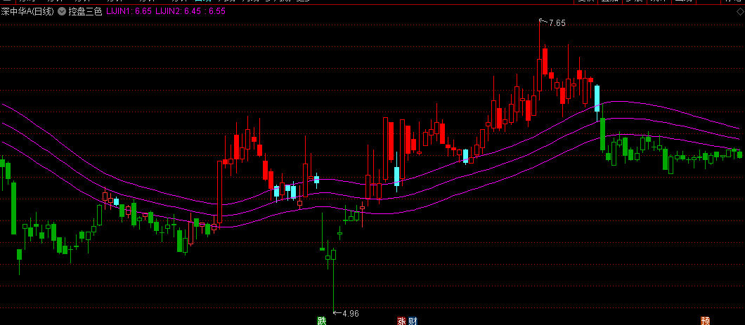 1.红色区域:当收盘价突破上轨时,绘制红色K线,提示主力拉升阶段