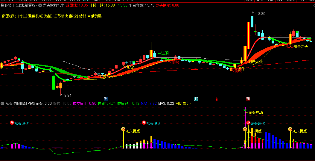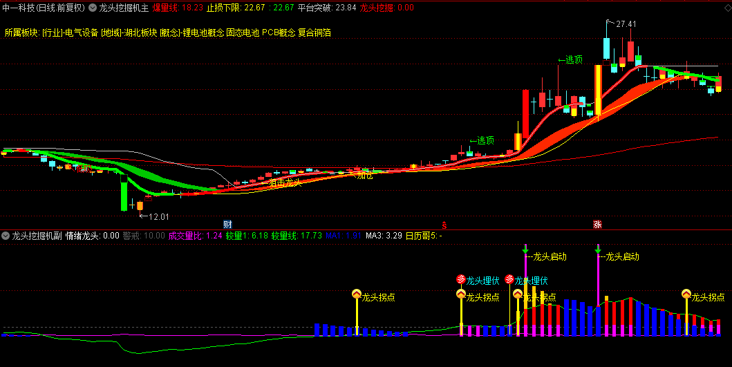 需结合板块热度,顶部显示的行业/概念,避免在绿色粗线与逃顶信号时追高。