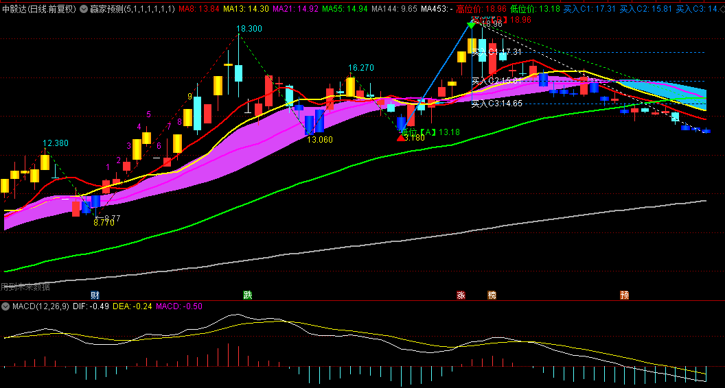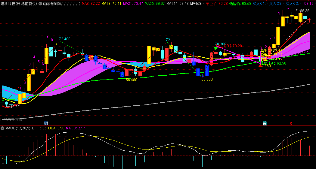 【赢家预测】主图指标 叠加结构带+九转序列+预测划线+婓波拉契均线