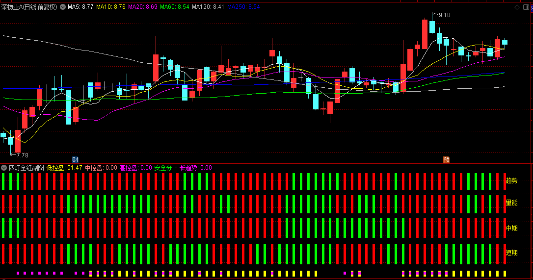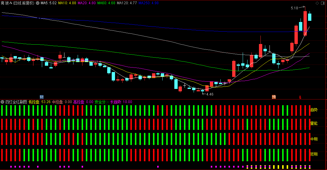 实际运用需结合大盘环境,当出现四灯全红+高控盘(紫色信号)时成功概率最高,建议配合止损策略使用。