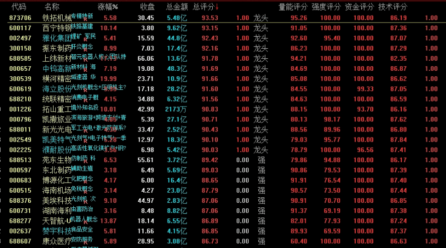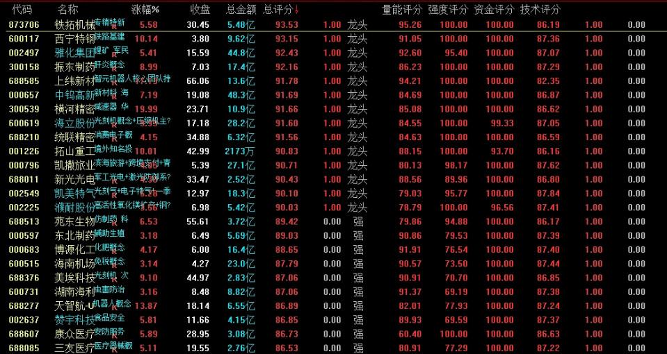 按打分结果“总评分”降序就会出现龙头、强、优等指标显示。
