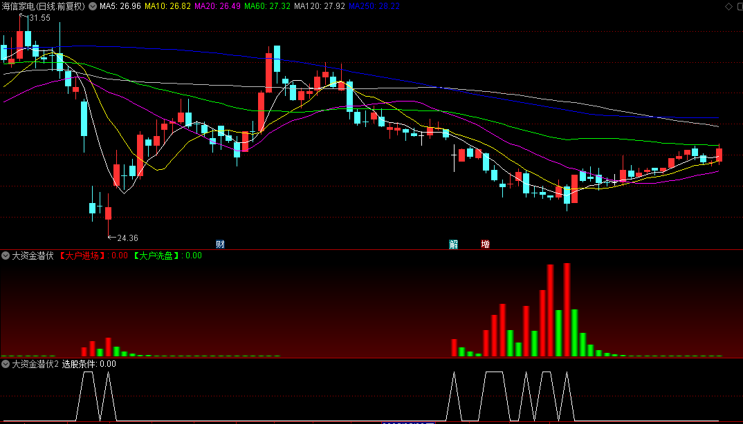 通达信【大资金潜伏】副图/选股指标公式,通过彩色柱状信号辅助判断资金介入与洗盘行为!