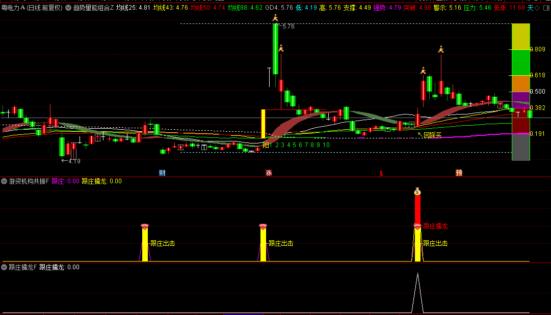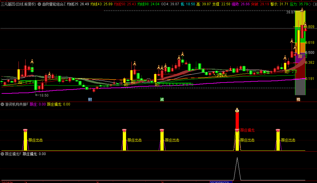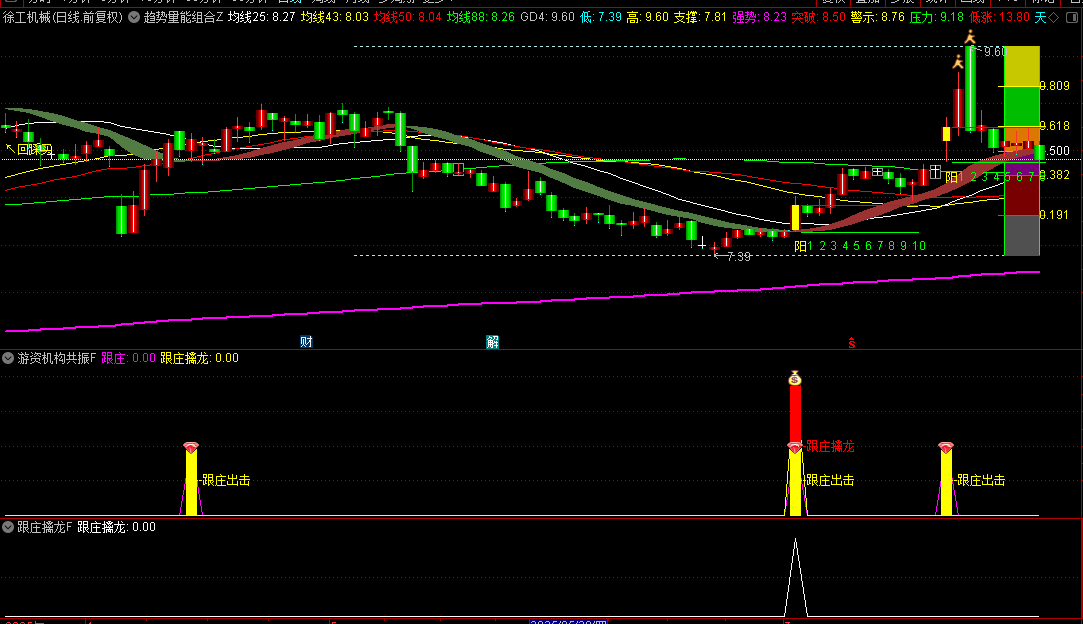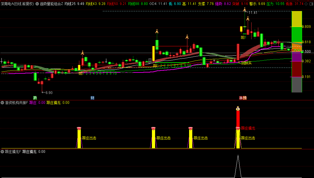 趋势量能组合主图,游资机构共振幅图和跟庄擒龙选股指标