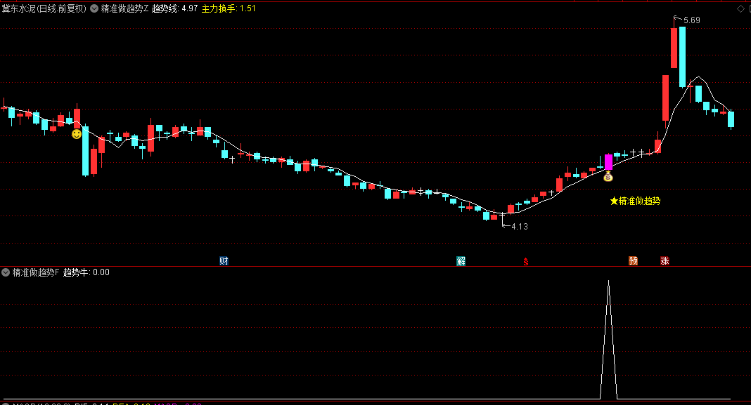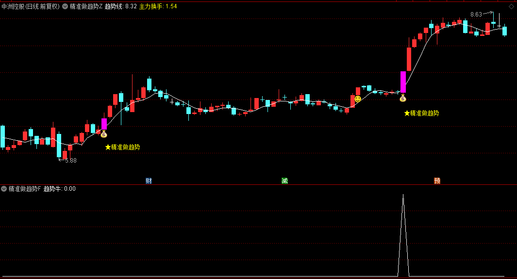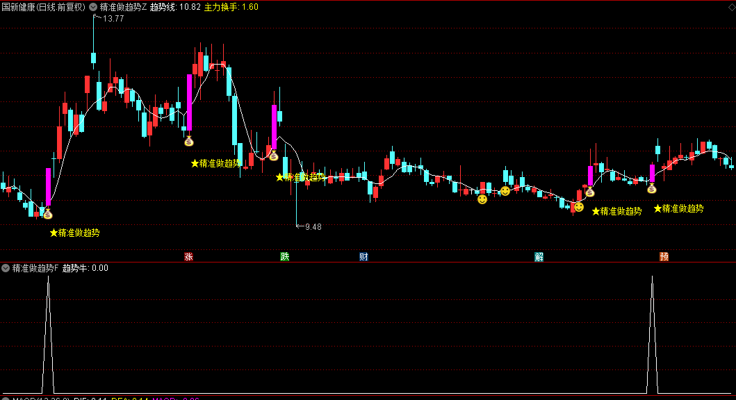 用于识别个股趋势转折点,通过5日均线判断短期趋势方向。当出现紫色柱状信号(标注"精准做趋势")时,表示股价突破关键压力位,且量价配合良好,为短线强势启动信号。配合MACD金叉及多指标共振可提高准确性。