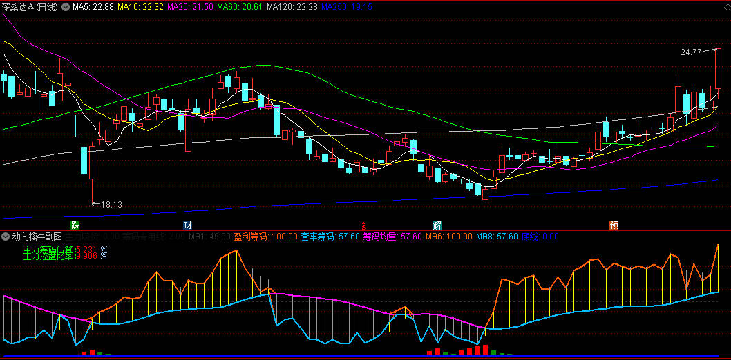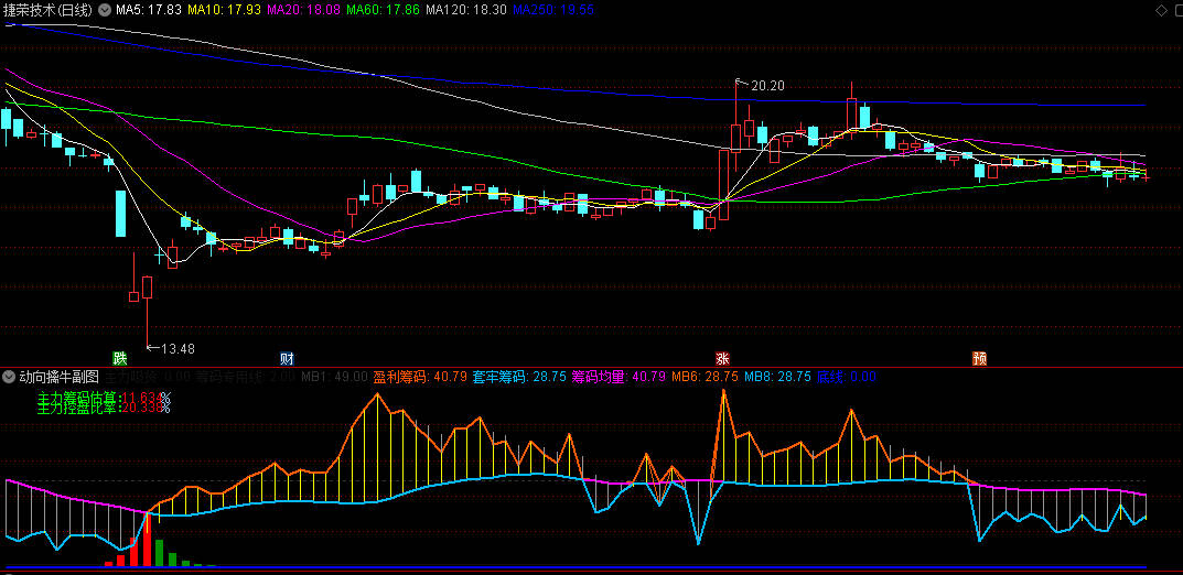 3.筹码分界线(黄色与灰色区域):盈利筹码(黄线)上穿均量线时,预示上涨潜力;套牢筹码(灰线)下行则反映抛压减轻。