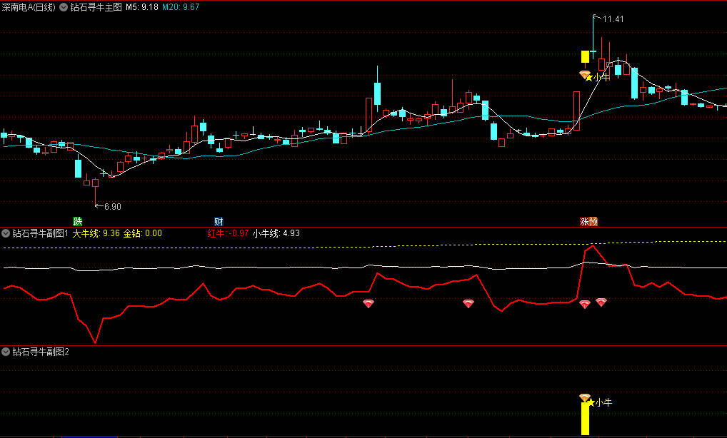 小牛信号:当红牛线(特色趋势线)向上穿越小牛线(白色),且主图出现“金钻”图标时,释放短期启动信号,对应【金钻小牛选 gu公式】,信号数量适中,适合短线捕捉活跃股;