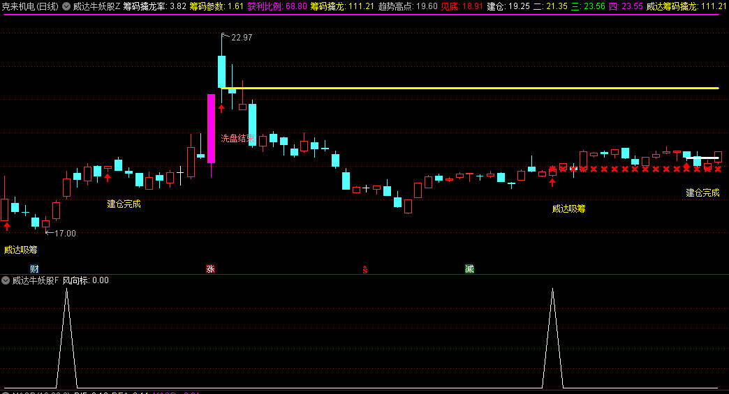 本指标专为捕捉强势妖股设计,通过筹码分布与价格波动分析,识别主力建仓、洗盘、出货等关键阶段。主图可直观显示涨停/跌停信号及筹码集中度,副图用于确认趋势反转时机,选股公式可快速筛选符合启动条件的个股。