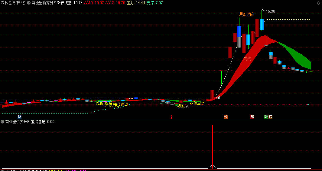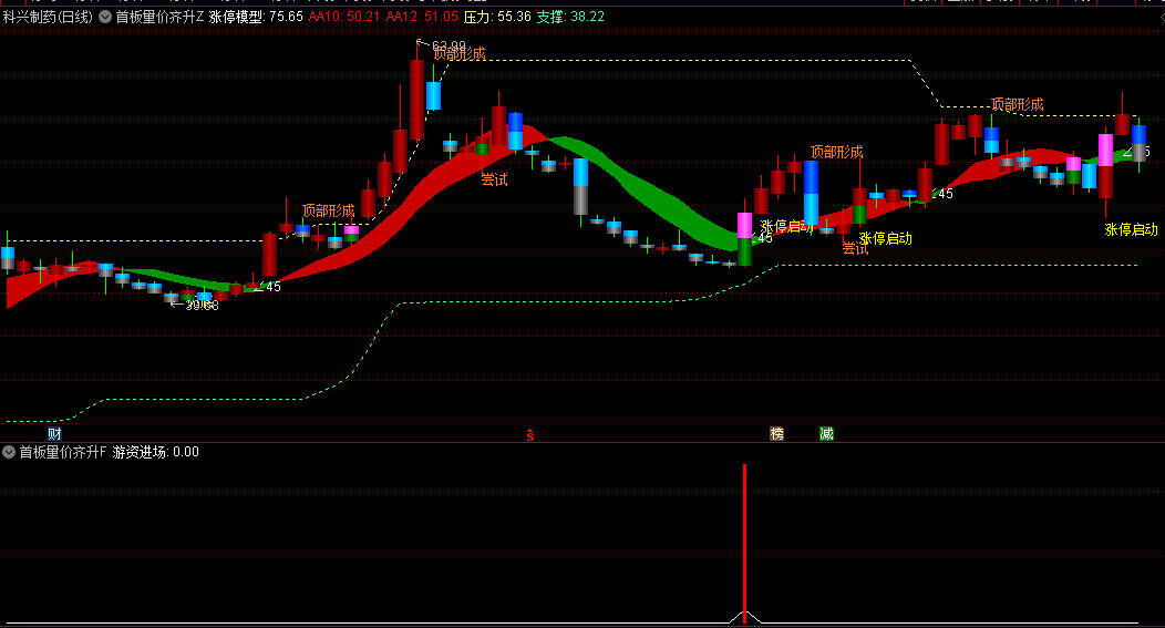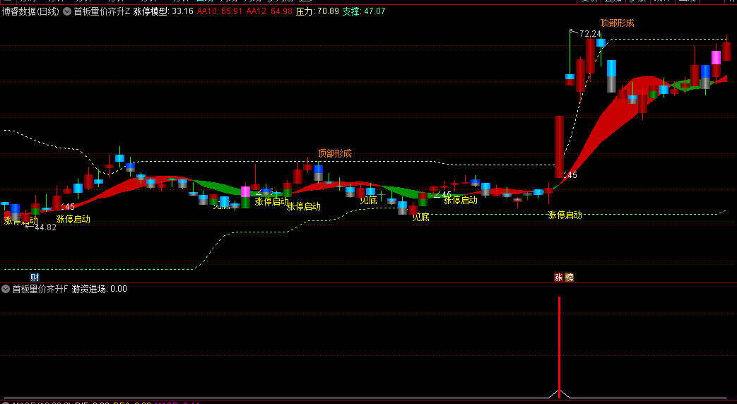 该指标主要用于捕捉个股首板涨停时的量价共振信号,辅助判断强势股的启动机会。通过主图、副图及选股功能,可识别以下机会: