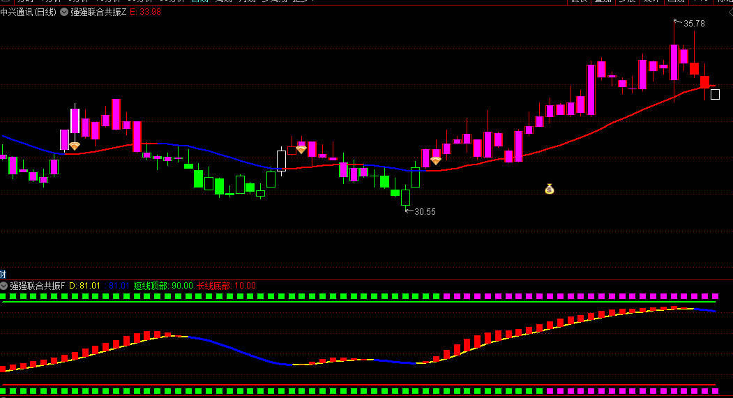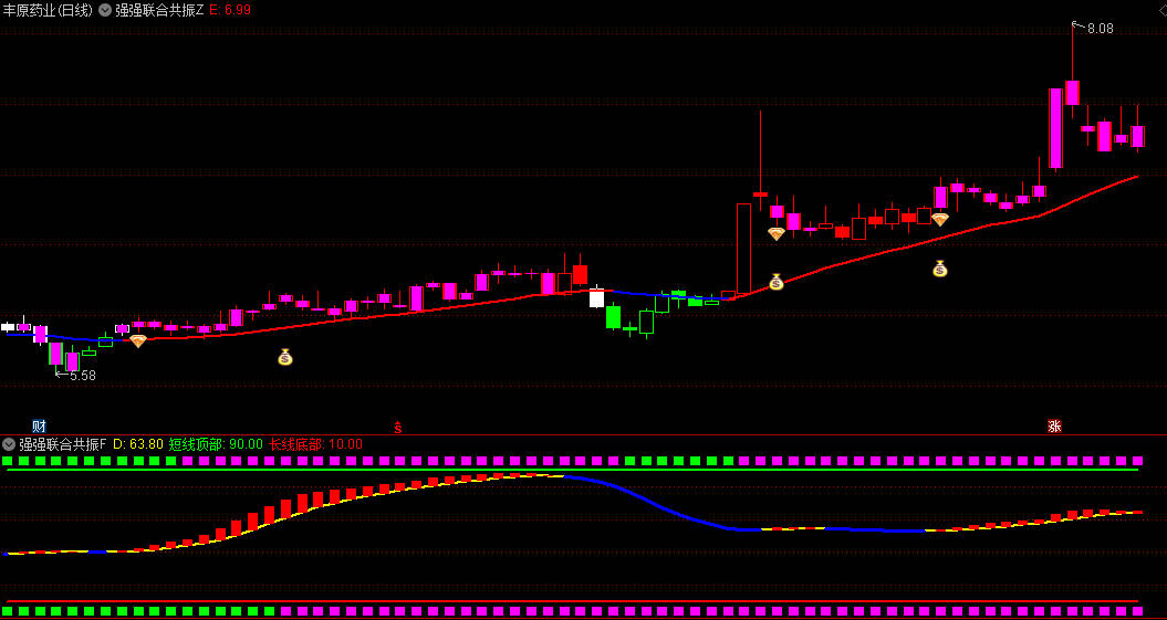 3.副图底部红绿带显示13/55日均线关系,顶部区域显示10/20日均线状态