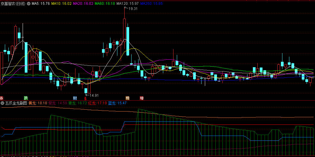 发一个五爪金龙指标,专抓起爆点公式。用法:红蓝两爪从青龙身体探出,直至上穿黄抓,同时黄紫两抓上下张开喇叭口,就是起爆点。该指标不含未来函数!