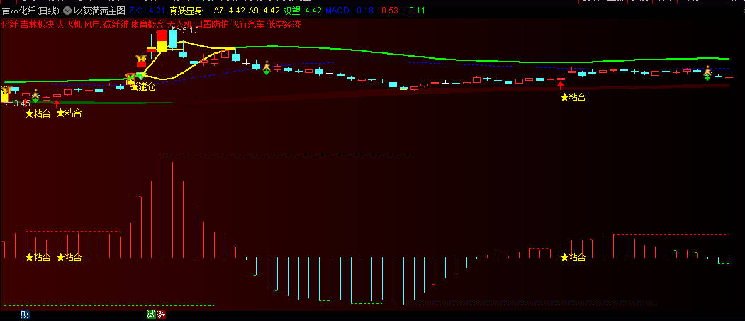 黄色K线:提示波段买入机会,结合成交量放大效果更佳。