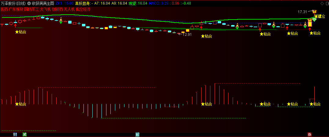 《收获满满》主图指标 通过蓝色虚线和红色实线显示股价的上下轨 识别趋势方向