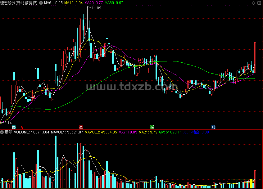 XA_13:=CROSS(CLOSE,XA_5) AND CROSS(VOL,QV) AND LAST(MAX(CLOSE,OPEN)<XA_6,XA_9-2,1) AND XA_9>=5 AND XA_9<=11 AND CLOSE>OPEN;