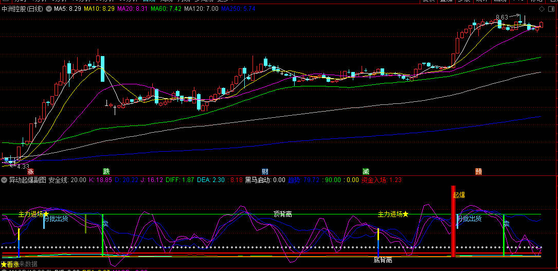 1.副图指标:加载后关注彩色信号标记(如蓝色"异动"文字、红黄柱状线),结合安全线位置判断强弱。