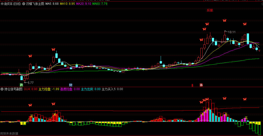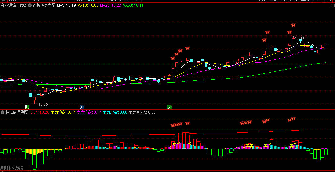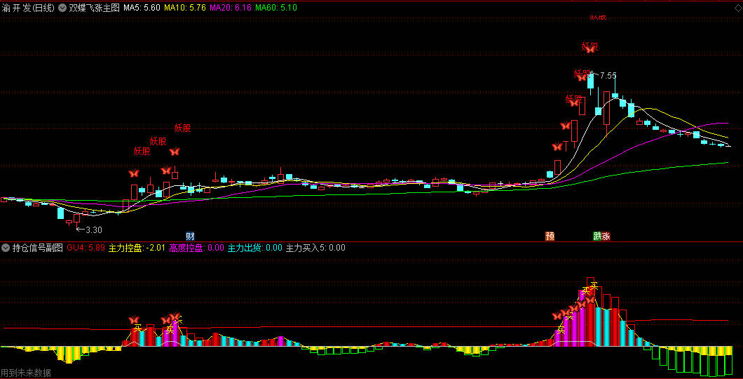 【双蝶飞涨】主图/副图/选股指标 结合持仓信号 主力动向趋势向上为最佳