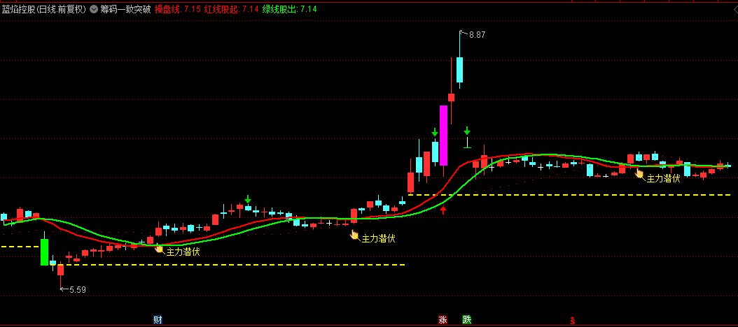 【筹码一致突破】主图指标 虚线多空分水岭 顶级信号主力潜伏 防坑指南