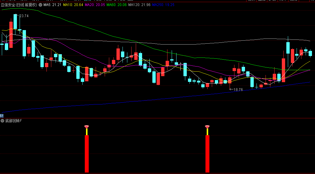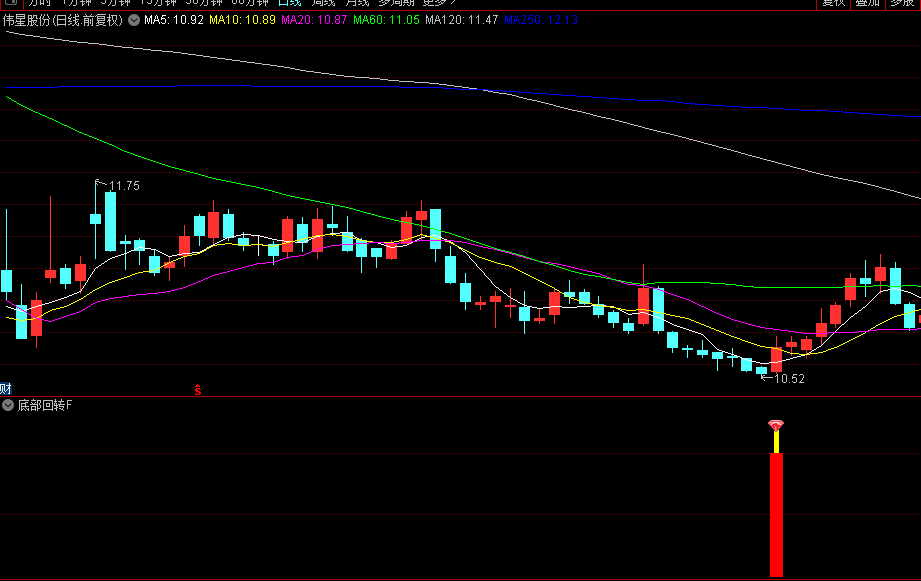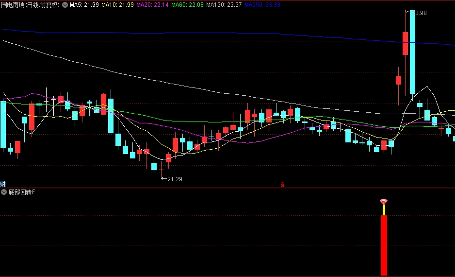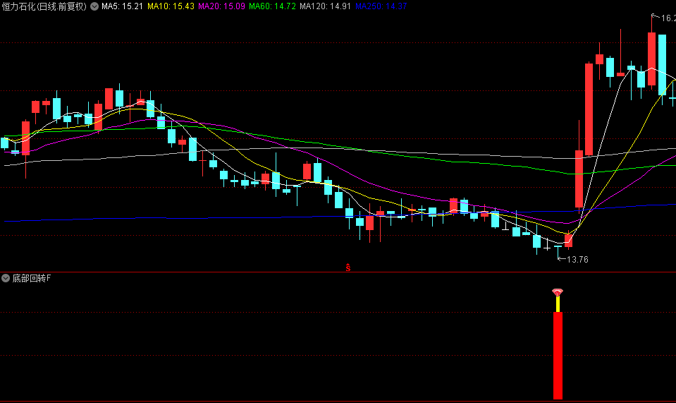 识别股价的潜在底部反转信号。该指标通过综合计算多个周期的价格波动、均线强度及相对位置关系,生成动态参考线(如回转、回转1、回转2等),当短期指标(回转4)上穿长期参考线且整体数值处于低位时,触发底部信号。