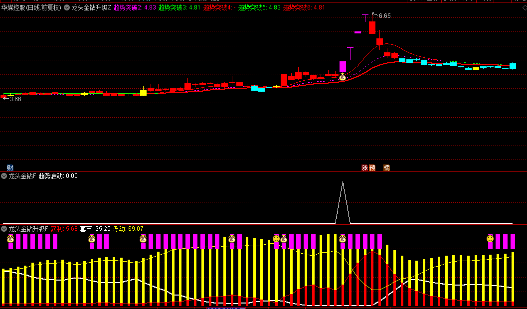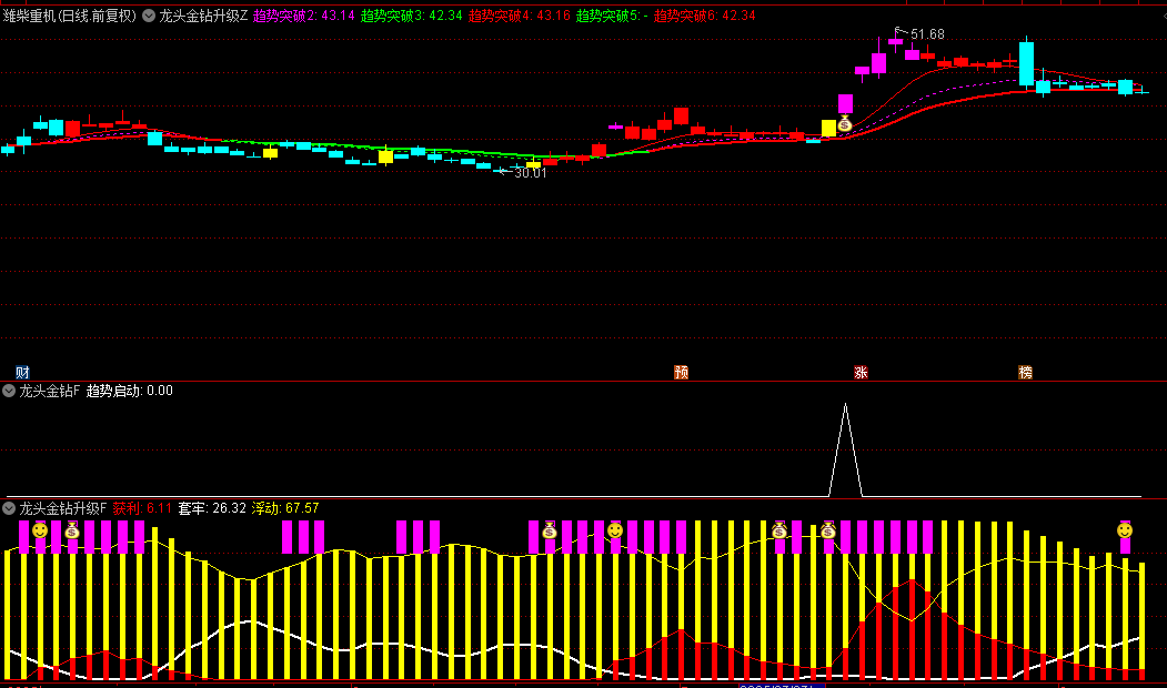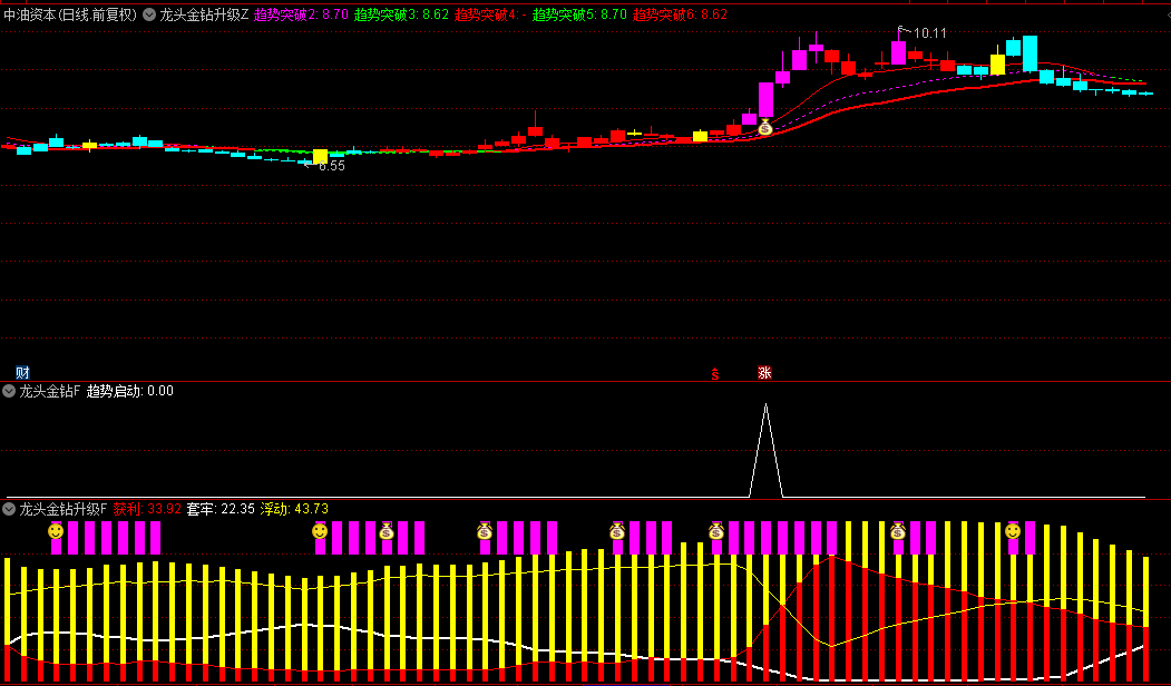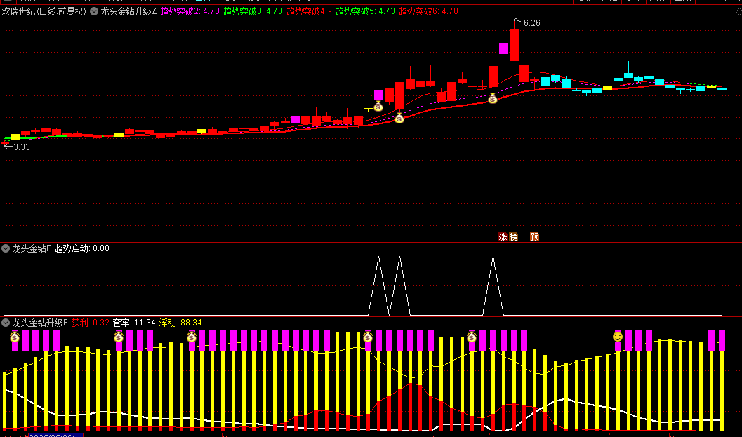 《龙头金钻升级版》通过动态牛熊线、主力突破通道及多空趋势线构建核心分析框架,结合CCI趋势启动指标识别强势行情起点,并以红黄双色柱状图直观标记买卖时机。