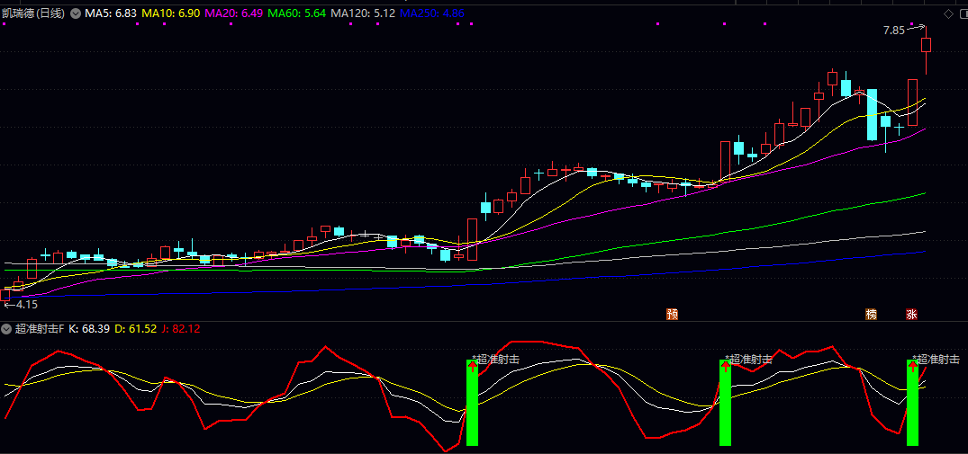 指标核心功能体现在副图区域会以醒目的红色箭头标记买入信号,并标注"超准射击"提示文字。其特色在于能精准识别股价经历短期回调后,首次出现单日涨幅超过8.5%的突破走势,这类形态往往预示着主力资金的强势介入。