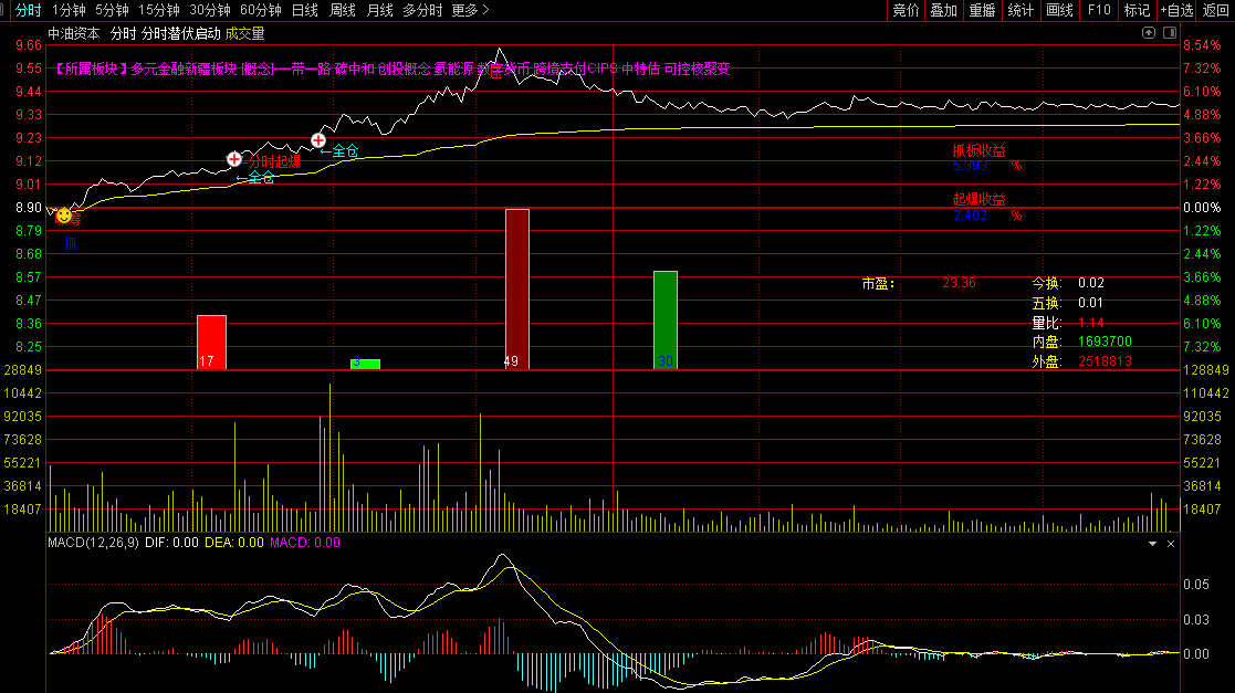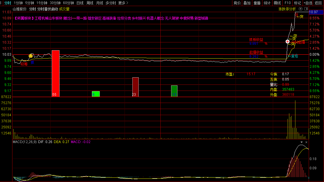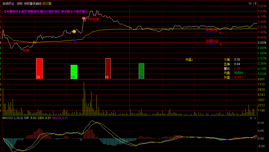 该指标专为捕捉个股分时图中的主力启动信号设计,综合了量价分析、资金动向及技术形态,帮助投资者识别短线爆发机会。主要功能包括: