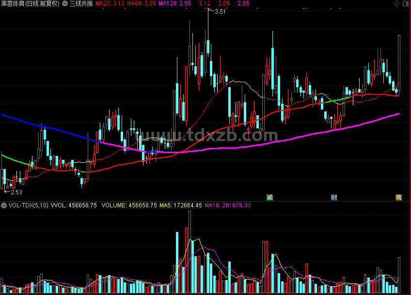 三条均线参数是20、60、120,基础指标加变色。