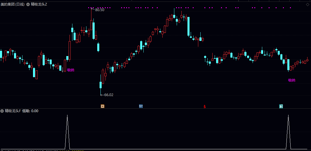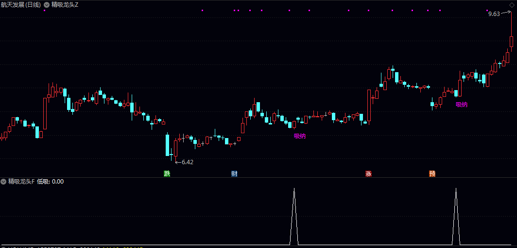 1.主图/副图应用:加载后,图表会显示“吸纳”信号(粉色文字及图标),提示符合低位启动条件的个股。