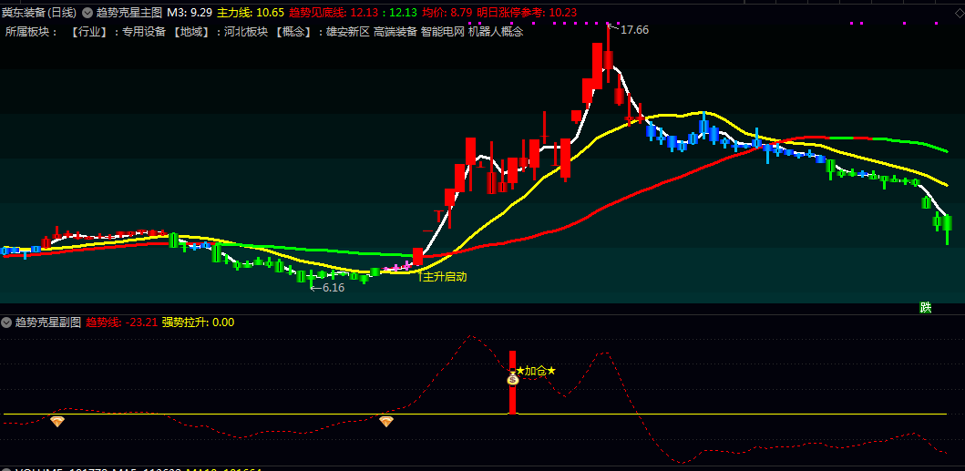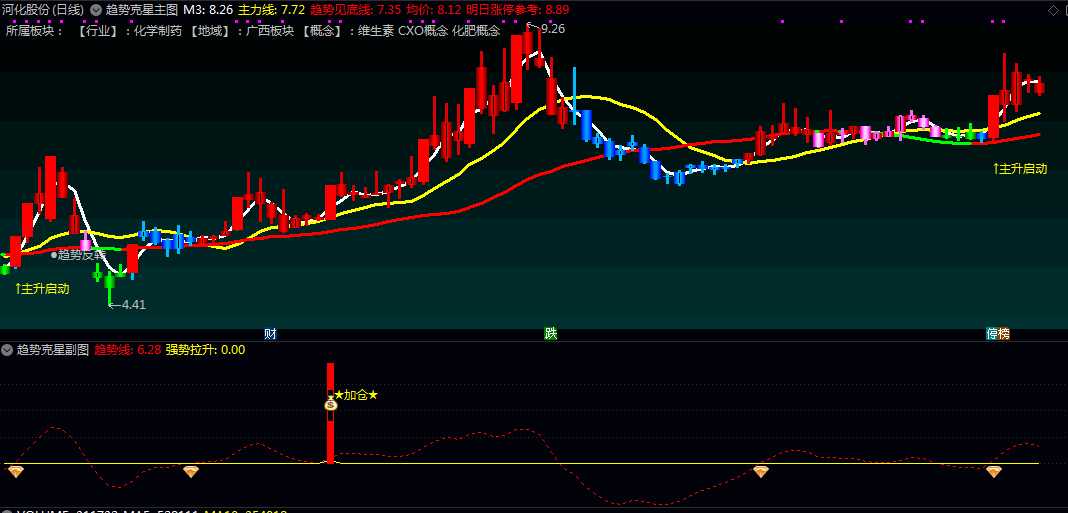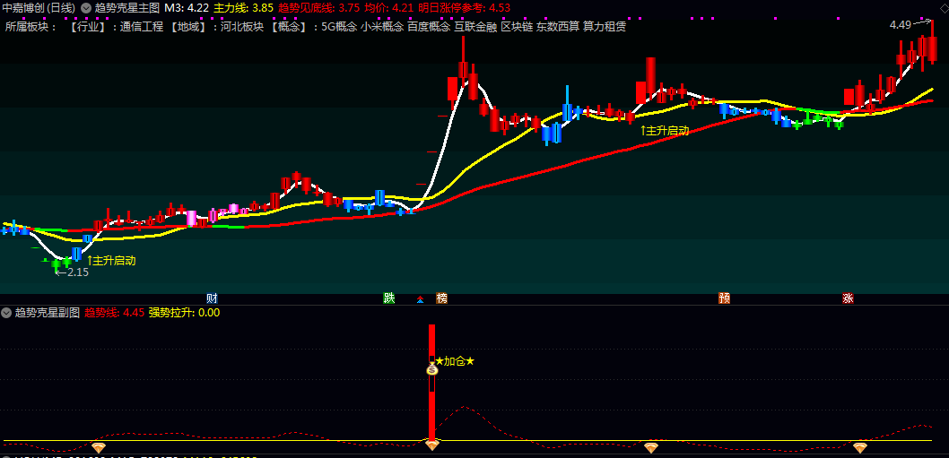 副图指标:红色趋势线突破时结合"★加仓★"提示,可确认强势拉升阶段。当出现红色柱状信号且伴随图标时,适合短线跟进。