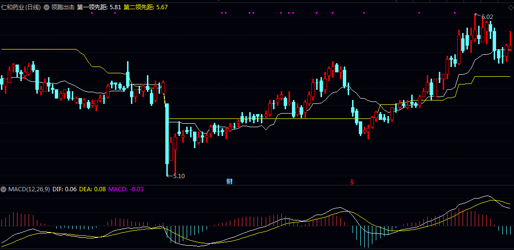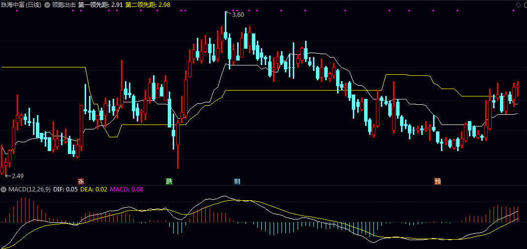 卖出参考:价格跌破第二领先距且色块收缩,配合阴线(黄色K线)需警惕回调。