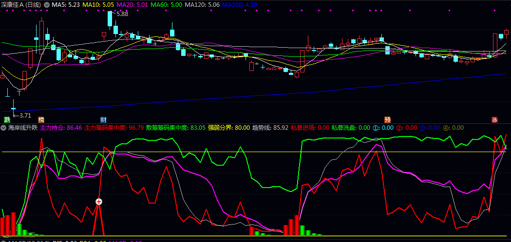 1.主力信号:紫线(主力持仓)上穿黄线(强弱分界)且红柱(私募进场)放大时,视为买入信号;绿柱(私募洗盘)延长需警惕回调。