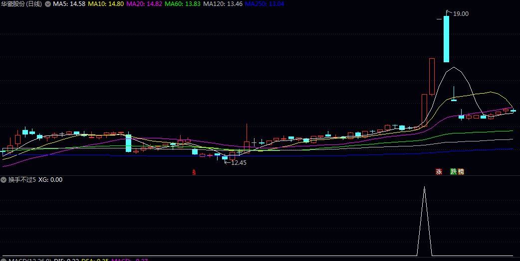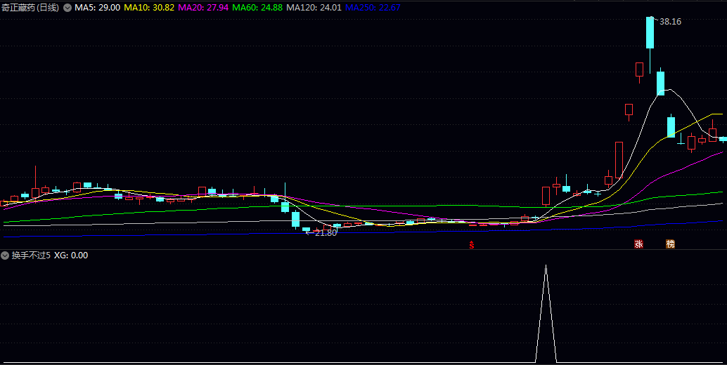 首板换手不过5,这里的5指的是换手率不超过5%,首板的换手率不超过5%,往往是妖股启动的标志,通过大数据的梳理,这个温和的换手率是绝大部分妖股启动的必要条件,换手过高,跟风盘较多,换手过低,热度又不够,5%恰到好处,既能吸引抬轿子的筹码,又不至于失去控制,这也是经验的总结。 选股指标选出来以后,加入自选,有的次日就启动了,有的是震荡后启动,可以结合情绪和热点综合分析考虑进场机会。本指标为本人收集、使用、优化的指标。