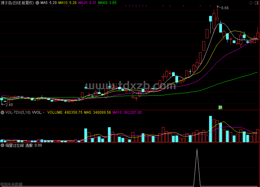 百分比:=10;{可调为5-20}左峰高:=CONST(PEAK(1,百分比,1));缩量:=V<0.8*HHV(V,20);{量小于20天内最高量的0.8倍}