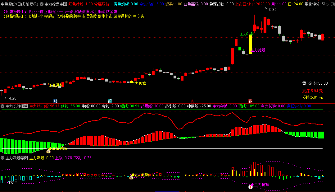 1、主力操盘主图在最上面显示个股详细情况,红色持股,青色观望、白色离场,今日进场价及今日离场价,量化评分及支撑和反转价,主图包含四个信号,逢低进场、主力吸筹、主力抢筹、主力入驻文字信号直观方便,主图添加了板块信息及最近情绪等,量化评分越大越好。
