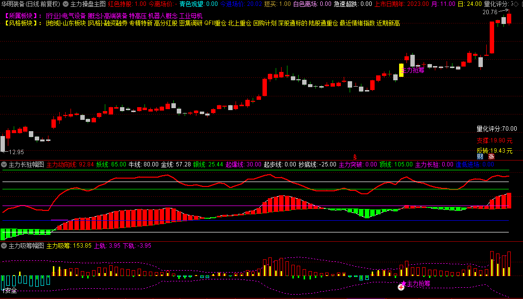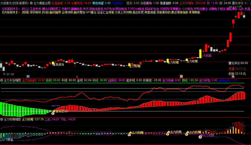 2、主力长驻幅图:红柱为多绿柱为空,做低位波段会发出逢低进场信号,当发出信号后,在绿柱上时等变红柱后操作,若信号在红柱上可轻仓进场,及时关注主力动向线趋势从低部向上,幅图做了分段,抄底线、起步线、起爆线,牛线、妖线等,判断个股目前趋势处于那个阶段,当突破牛线时,满足条件会出现主力长驻信号。