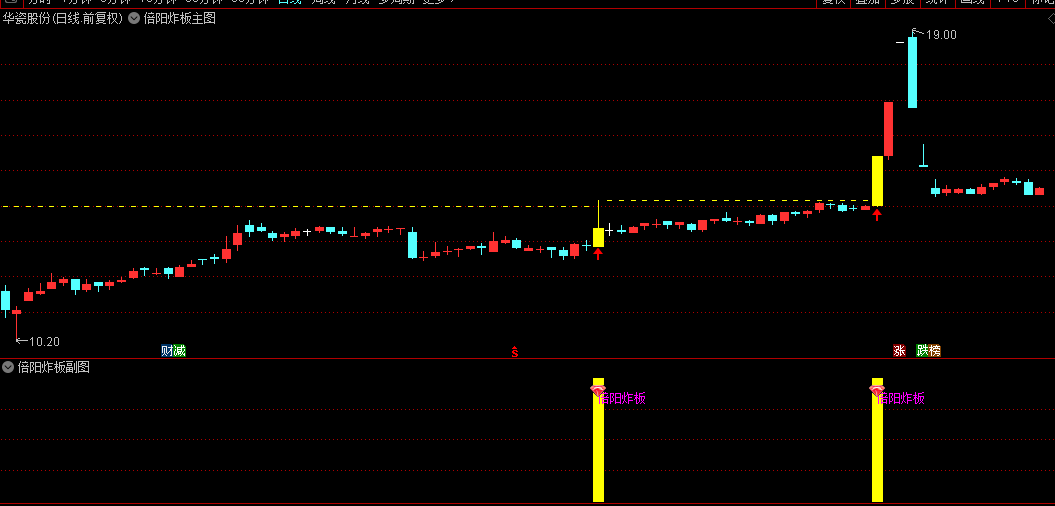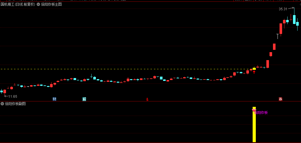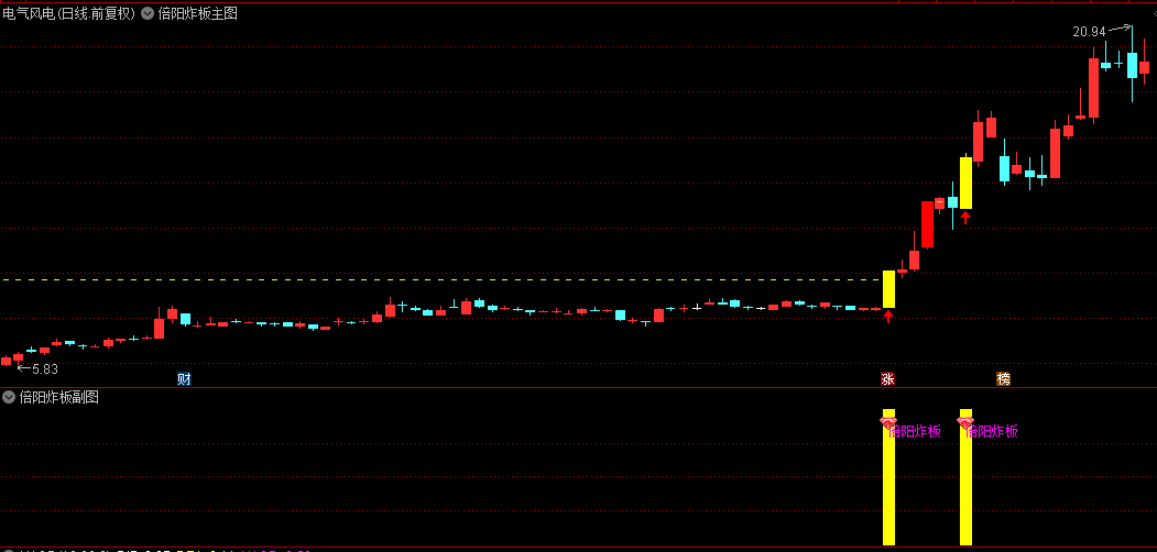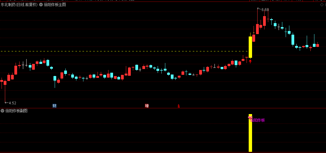 副图:当出现"倍阳炸板"文字提示及图标时,表示符合突破条件。